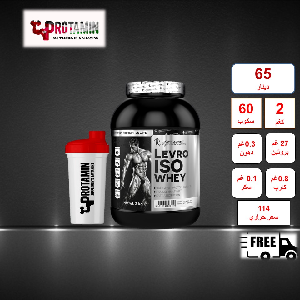 ليفرو ايزو من شركة كيفن ليفروني. متوفر بنكهة الشيكولاتة والفراولة والفانيلا. 2 كغم ، يحتوي على 60 حصة، كل حصةتحتوي على 27 غرام بروتين ، 0.8 غرام كارب ، 0.17غم سكر ، 0.33 غم دهون .